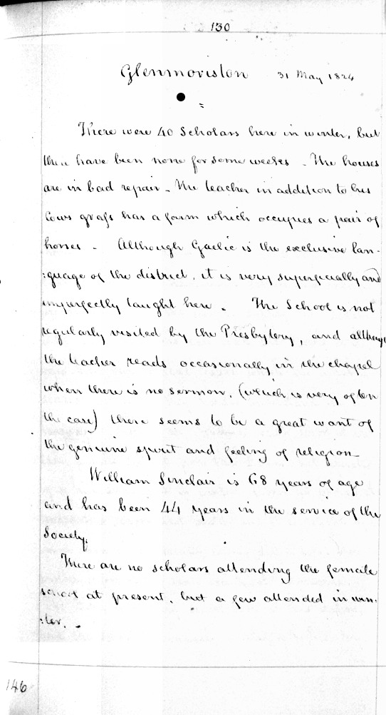 There were 40 scholars here in winter, but there have been none for some weeks – the houses are in bad repair. The teacher in addition to his cours grass has a farm which occupies a pair of horses. Although Gaelic is the exclusive language of the district, it is superficially and imperfectly taught here. The school is not regularly visited by the presbytery, and although the teacher reads occasionally in the chapel when there is no sermon, (which is very often the case) there seems to be a great want of the genuine spirit and feeling of religion.